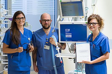 Durch Eigeninitiative zum Erfolg: Lisa Dietmar, Jana Ruppel und Tobias Heckelsmüller haben den begehrten Pflegepreis der Deutschen Gesellschaft für NeuroIntensiv- und Notfallmedizin gewonnen. Alle drei sind Gesundheits- und Krankenpfleger für Intensiv- und Anästhesiepflege DKG der Neuro-Intensivstation der Neurologischen Klinik (Direktor: Prof. Dr. Dr. h. c. Stefan Schwab) des Universitätsklinikums Erlangen. In einer Studie an 20 Patienten hatten sie nachgewiesen, dass die Beatmungszeit von Komapatienten durch das Vorspielen von Angehörigenstimmen verkürzt werden kann.