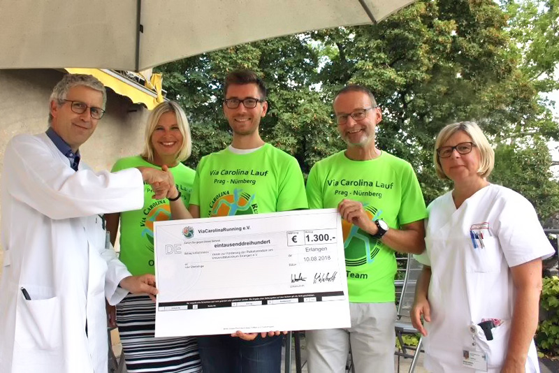 Von Prag nach Nürnberg verläuft die 324 Kilometer lange Via Carolina - die alte Reise- und Handelsroute, die ambitionierte Läufer beim "Via Carolina Running" zurücklegen. Der Lauf wurde vor zwölf Jahren ins Leben gerufen. Seither laufen die Teilnehmer regelmäßig für einen gemeinnützigen Zweck, seit zwei Jahren unter dem Motto "Laufen gegen Krebs". Am 7. und 8. Juli 2018 wurde jetzt mit einem Benefizlauf dem Begründer des Laufs, Mario Wallrath, gedacht, der im März 2017 in der Palliativmedizinischen Abteilung (Leiter: Prof. Dr. Christoph Ostgathe) des Universitätsklinikums Erlangen verstarb.