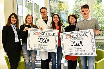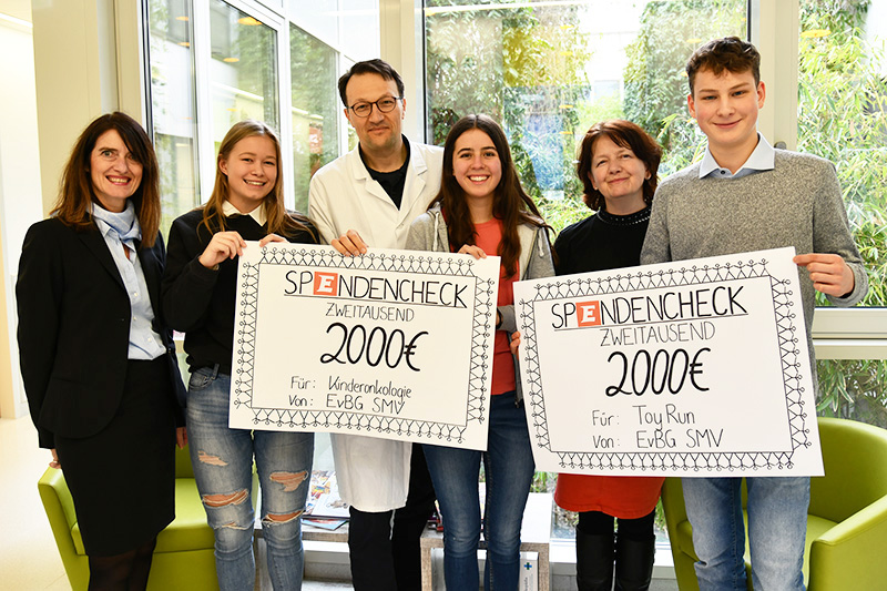 Am „Sozialen Tag“ des Emil-von-Behring-Gymnasiums Spardorf liefen Schüler vergangenes Jahr etliche Runden für den guten Zweck. 4.000 Euro aus dem Spendenlauf möchten die Gymnasiasten an schwer kranke Kinder und Jugendliche weitergeben. Sarah Löwe, Mara Nelegatti und Anton Hax von der Schülermitverwaltung (SMV) überreichten zusammen mit der Schulleiterin Nora Leykamm nun zwei Spendenschecks in Höhe von jeweils 2.000 Euro an Prof. Dr. Markus Metzler, Leiter der Kinderonkologie der Kinder- und Jugendklinik (Direktor: Prof. Dr. Joachim Wölfle) des Universitätsklinikums Erlangen, und Marion Müller, leitende Erzieherin der Kinderklinik und erste Vorsitzende des Vereins Toy Run – Träume für kranke Kinder Erlangen.