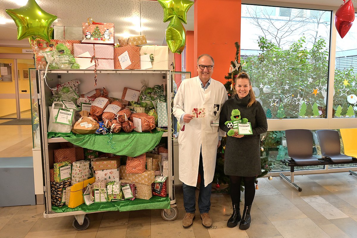 Wenn ein Klinikdirektor zum Torjäger wird und Kinderaugen strahlen, kann das nur eines bedeuten: Die SpVgg Greuther Fürth ist zu Besuch in der Kinder- und Jugendklinik (Direktor: Prof. Dr. Joachim Wölfle) des Uniklinikums Erlangen. Im Gepäck hatte sie rund 100 liebevoll verpackte Geschenke für die jungen Patientinnen und Patienten. Von Lego-Sets, einer Kinderkamera bis hin zu Fußbällen und dem Plüsch-Maskottchen Eddy waren alle möglichen Spielzeuge dabei. Neben Geschenken brachten die Kleeblätter aber vor allem eines mit: Zeit. Eine Fotobox, Glitzertattoos und ein Mini-Tor bereiteten den Kindern und Jugendlichen einen ausgelassenen Nachmittag. Und auch Prof. Dr. Joachim Wölfle ließ es sich nicht nehmen, den ein oder anderen Torschuss zu wagen. Für ihn und die jungen Patientinnen und Patienten wanderte Mittelfeldspieler Juan Cabrera auch gerne mal ins Tor. „Das ist eine wirklich wunderbare Weihnachtsaktion – herzlichen Dank!“, waren sich der Direktor und das gesamte Erzieherinnenteam der Kinderklinik einig.