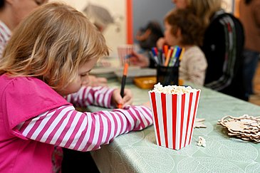 Patientinnen und Patienten sowie Geschwisterkinder konnten Windspiele kreativ gestalten und sich die neuesten Kinderbücher zu Drachen, Wind und anderen herbstlichen Themen genau anschauen. Alle Kinder, die fit genug für den Weg ins Foyer der Kinderklinik waren, konnten an der Aktion teilnehmen und so in herbstliche Stimmung gelangen. Als kleine Stärkung während des Programms gab es frisches Popcorn, direkt aus der Popcornmaschine.