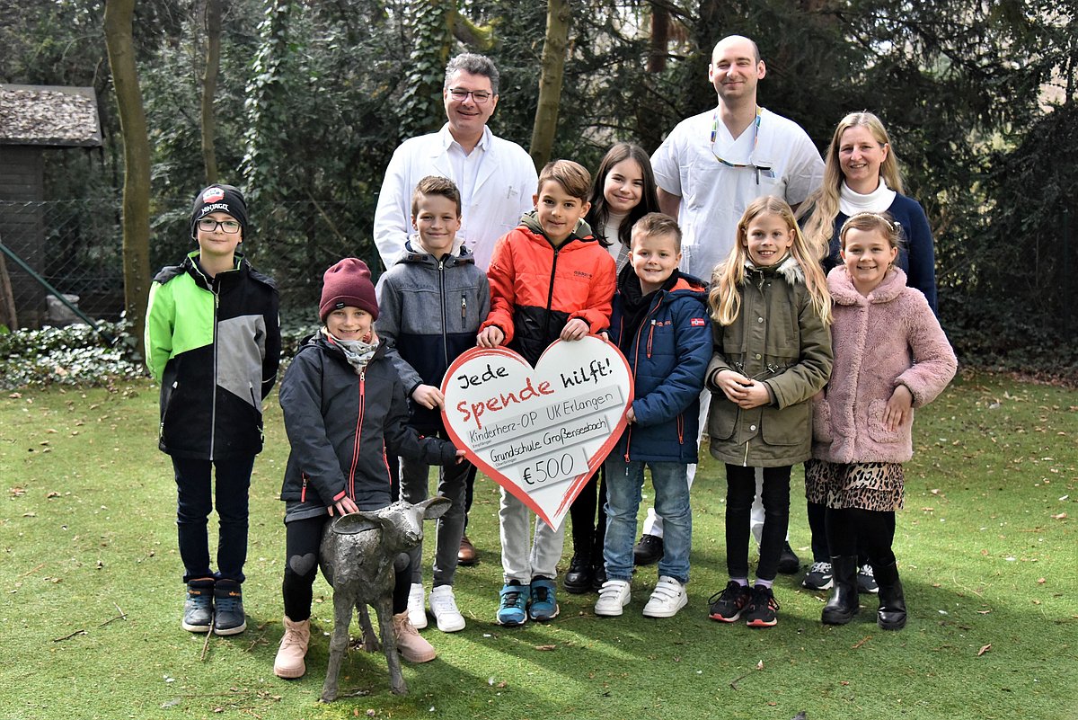 Papiersterne, Waffeln, Weihnachtsengel – bei ihrem Adventsbasar verkauften die 96 Schülerinnen und Schüler der Grundschule Großenseebach im Dezember 2022 allerlei Selbstgemachtes an ihre Eltern und Lehrkräfte. Das Ziel der vorweihnachtlichen Veranstaltung war es, möglichst viel Geld für die Aktion „Kinderherz-OP“ der Kinderkardiologischen Abteilung (Leiter: Prof. Dr. Sven Dittrich) und der Kinderherzchirurgischen Abteilung (Leiter: Prof. Dr. Oliver Dewald) des Uniklinikums Erlangen zu sammeln. Den Erlös von 500 Euro übergaben nun acht Schülerinnen und Schüler gemeinsam mit ihrer Lehrerin Karin Fuchs stellvertretend für die gesamte Schule in Form eines – passenderweise herzförmigen – Spendenschecks an Prof. Dr. Oliver Dewald und Kardiotechniker Andreas Teske.