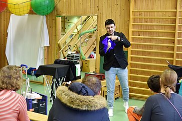Insgesamt sechs Mal trat Sebastian Lehmeier in diesem Jahr in der Erlanger Kinderklinik auf. Mit seinem Zauberhut, einem Zauberstab, bunten Tüchern, aus dem Nichts auftauchenden kleinen Bällen und vielen weiteren Überraschungen sorgte er für ein breites Lächeln auf den Gesichtern der kleinen Patientinnen und Patienten. „Wichtig ist mir, dass die Kinder trotz ihrer Krankheit etwas Ablenkung aus dem Klinikalltag erfahren und für einen Moment in die Welt der Magie eintauchen können“, erklärte der Magier.