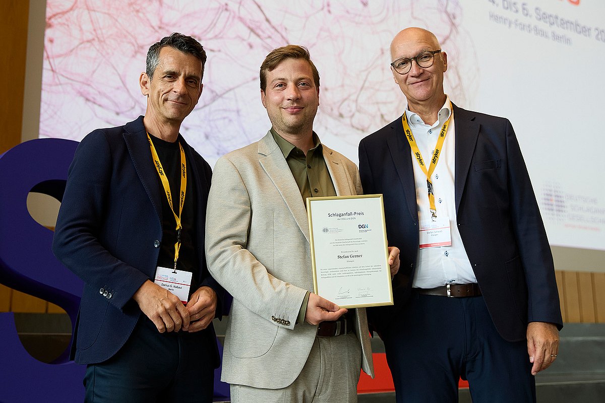 PD Dr. Stefan Gerner wurde für seine herausragende Forschungsleistung auf dem Gebiet der zerebrovaskulären Erkrankungen mit dem Schlaganfall-Preis 2025 ausgezeichnet. „Ich freue mich sehr über diese Anerkennung“, so der geschäftsführende Oberarzt der Neurologischen Klinik (Direktor: Prof. Dr. Dr. h. c. Stefan Schwab) des Uniklinikums Erlangen. „Sie gehört auch meinem Team, das Tag für Tag daran arbeitet, medizinischen Fortschritt für unsere Patientinnen und Patienten erlebbar zu machen.“ Der mit 5.000 Euro dotierte Preis der Deutschen Schlaganfall-Gesellschaft (DSG) und der Deutschen Gesellschaft für Neurologie (DGN) wurde im Rahmen des ersten Deutschen Schlaganfallkongresses in Berlin verliehen.