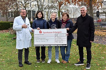 Was lange währt, wird endlich gut: Vor drei Jahren veranstalteten die Mitglieder der Schülermitverantwortung (SMV) des Gymnasiums Fridericianum Erlangen eine Weihnachtsfeier für Schülerinnen und Schüler, Lehrkräfte und Eltern in der Aula des Gymnasiums. Die Hälfte des Erlöses aus dem Verkauf von Speisen und Getränken geht nun an die Aktion „Kinderherz-OP“ der Kinderkardiologischen Abteilung (Leiter: Prof. Dr. Sven Dittrich) und der Kinderherzchirurgischen Abteilung (Leiter: Prof. Dr. Oliver Dewald) des Uniklinikums Erlangen. Aufgrund der Coronapandemie hatte sich die offizielle Spendenübergabe mehrfach verzögert. Umso mehr freuten sich nun alle Beteiligten, als Schulleiter Gerhard Nöhring, Verbindungslehrerin Susanne Segler und die beiden Schülersprecherinnen An-An Fu und Julika Segler die Spende in Höhe von 420 Euro in Form eines Schecks an Prof. Dr. Sven Dittrich überreichten.