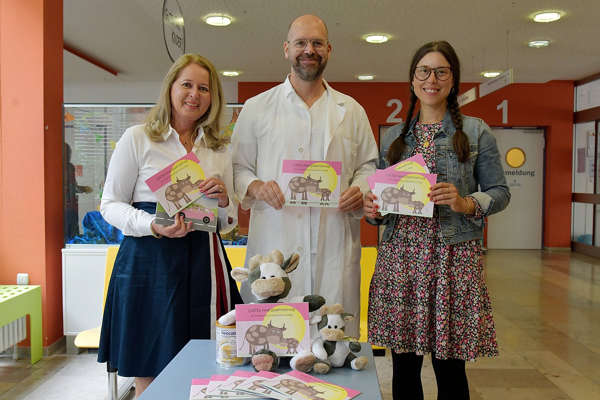 Die Symptome können Eltern Angst machen: Ihr Kind erbricht sich sehr heftig und nahezu unaufhörlich. Dabei wirkt es extrem krank und kraftlos. Später kommt manchmal noch Durchfall dazu. Das Kind kann dehydrieren, der Blutdruck abfallen. Es handelt sich hierbei möglicherweise um FPIES (Food Protein Induced Enterocolitis Syndrom) – eine durch Nahrungsmitteleiweiß verursachte Entzündung der Dünn- und Dickdarmschleimhaut. „FPIES ist eine eher seltene Form der Nahrungsmittelallergie. Sie zu diagnostizieren, ist echte Detektivarbeit“, erklärt Prof. Dr. André Hörning, Oberarzt und Leiter der Pädiatrischen Gastroenterologie und Hepatologie in der Kinder- und Jugendklinik (Direktor: Prof. Dr. Joachim Wölfle) des Uniklinikums Erlangen. „Es gibt entsprechend viel Aufklärungsbedarf hinsichtlich der Ursachen und der passenden Diagnostik und Therapie.“ Umso mehr freute sich Prof. Hörning jetzt über das neue kindgerechte Buch von Autorin und Illustratorin Jennifer Hetzel, das das Thema FPIES für Eltern und Kinder anschaulich und verständlich aufbereitet. Mit Unterstützung der Erlanger Nutricia Milupa GmbH wurden zunächst 1.000 Exemplare gedruckt. Alle Eltern, deren Kind am Uniklinikum Erlangen die Diagnose FPIES erhält, sollen künftig ein Buch erhalten.