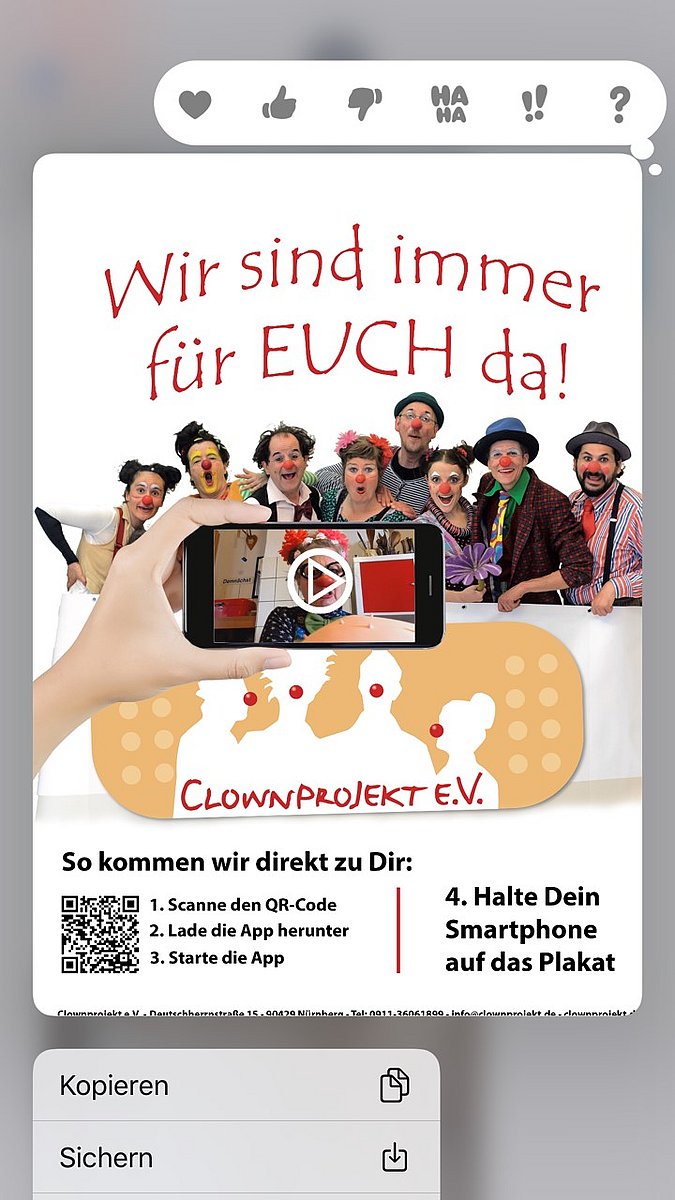 Über den QR-Code auf dem Poster und den eigens gedruckten Postkarten können sich alle interessierten Kinder und Eltern die kostenfreie App unkompliziert aufs Smartphone laden. Im ersten Video erscheinen die Klinikclowns in einem grünen Garten, wo sie immer wieder hinter Bäumen hervorlugen und lustige Späße treiben. Mindestens ein neues Video pro Woche wollen die Klinikclowns für die Kinder produzieren. Die App programmierte ein Webdesigner innerhalb weniger Wochen als Spende für das Clownprojekt. „Das ging rucki, zucki“, lacht Clown Pišta, in dessen Garten das erste Video entstand. „Wir freuen uns sehr über die engagierte Arbeit unserer Klinikclowns und danken Ihnen herzlich für diese fröhliche Idee, obwohl die Arbeitsbedingungen für freie Künstler zurzeit gar nicht lustig sind“, lobte Klinikdirektor Joachim Wölfle das kreative Potenzial der Klinikclowns.
