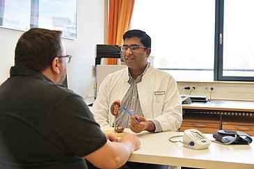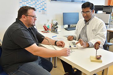 Bei Markus Stöckel aus dem Landkreis Forchheim wurde die Nierennervenablation bereits durchgeführt. Er erhielt die Diagnose Hypertonie 2011. Damals ging er mit starken migräneartigen Kopfschmerzen zum Hausarzt, der Blutdruckhöchstwerte von 270/160 mmHg feststellte. „Ein Blutdruck für drei“, sagt Markus Stöckel. Jahrelang nahm der heute 48-Jährige zehn Blutdrucktabletten täglich ein. „Das war schon fast ein ganzes Frühstück“, kommentiert er. Doch die Medikamente wirkten nicht wie erhofft. Ein Internist schickte den Patienten 2019 schließlich ans Uniklinikum Erlangen, wo das Team um Prof. Schmieder die Hypertonie medikamentös auf 160/110 mmHg senkte. Weil aber bereits Werte über 140/90 mmHg als Bluthochdruck gelten, war Markus Stöckel noch immer nicht optimal eingestellt. „Die Ärzte haben mir deshalb vorgeschlagen, an einer Studie teilzunehmen. Ich habe gesagt: Ich mache alles, was hilft.“ Im Juni 2021 verödete Radiologe PD Dr. Axel Schmid in Zusammenarbeit mit Facharzt Dr. Dennis Kannenkeril von der Medizin 4 die Nierennerven von Markus Stöckel im Rahmen einer Blindstudie. Bei dieser Studienform wissen die Teilnehmenden vorher nicht, ob sie der Behandlungs- oder der Kontrollgruppe angehören, denn: Dieses Wissen könnte ihre Erwartungen und ihr Verhalten beeinflussen. „Ich habe erst im Dezember 2021 erfahren, dass die Ablation bei mir tatsächlich gemacht wurde“, berichtet Markus Stöckel. Zu diesem Zeitpunkt war sein Blutdruck um weitere 10 mmHg auf 150/100 mmHg gesunken. Der Eingriff zeigte Wirkung und diese hält noch immer an. „Ich nehme heute statt zehn nur noch drei Blutdrucktabletten. Die Werte haben sich mittlerweile bei circa 135/90 mmHg eingependelt.“ Dass er trotz aller Therapieerfolge als Hypertoniker auch auf seine Lebensweise achten muss, ist Markus Stöckel bewusst. „Neuerdings arbeite ich nur noch vier Tage die Woche, womit es mir sehr gut geht. Und ich habe jetzt auch meine Ernährung umgestellt – auf weniger Fleisch und mehr Gemüse. Ich habe schon elf Kilo abgenommen.“