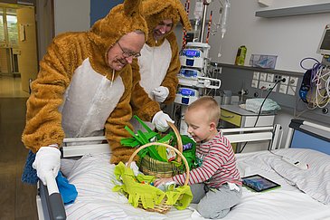 Ein Osterhase kommt nie zu spät – höchstens ein bisschen zu früh, um die Vorfreude auf das anstehende Fest noch zu steigern. So auch gestern (22.03.2018), als fünf Gäste mit langen Löffeln und plüschigen Pfoten über die Flure der Kinder- und Jugendklinik (Direktor: Prof. Dr. Dr. h. c. Wolfgang Rascher) des Universitätsklinikums Erlangen liefen. Die ungewöhnliche Visite hat seit 2004 Tradition, und jedes Jahr freuen sich die jungen Patienten, ihre Geschwister und Eltern über kleine Spielsachen und Süßigkeiten, die Wolfgang Rascher und Mitarbeiter der Firma SPIE GmbH überbringen.