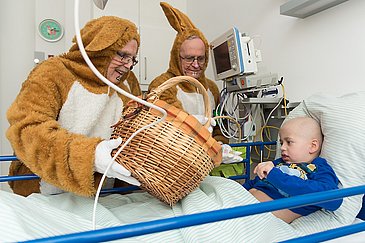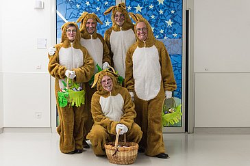 Nicht nur einer, sondern gleich fünf Osterhasen waren gestern auf den Stationen der Kinderklinik des Uni-Klinikums Erlangen zu beobachten. Reich bepackt mit Körben voller Süßigkeiten und Spielsachen - gespendet von der SPIE GmbH - klopften sie an die Patientenzimmer und überraschten so die jungen Bewohner, ihre Eltern und so manchen Mitarbeiter. "Auch, wenn wir diese Osteraktion bereits zum fünfzehnten Mal machen, ist es nie langweilig", sagte Prof. Rascher. "Jedes Jahr machen wir Kindern und Jugendlichen eine Freude, und das ist einfach der schönste Grund, das Hasenkostüm wieder anzuziehen."