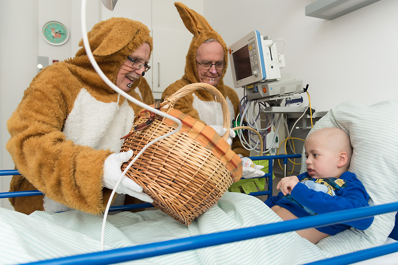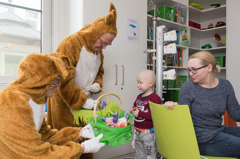 Ein Osterhase kommt nie zu spät – höchstens ein bisschen zu früh, um die Vorfreude auf das anstehende Fest noch zu steigern. So auch gestern (22.03.2018), als fünf Gäste mit langen Löffeln und plüschigen Pfoten über die Flure der Kinder- und Jugendklinik (Direktor: Prof. Dr. Dr. h. c. Wolfgang Rascher) des Universitätsklinikums Erlangen liefen. Die ungewöhnliche Visite hat seit 2004 Tradition, und jedes Jahr freuen sich die jungen Patienten, ihre Geschwister und Eltern über kleine Spielsachen und Süßigkeiten, die Wolfgang Rascher und Mitarbeiter der Firma SPIE GmbH überbringen.