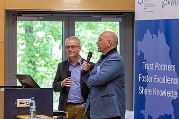 Ralf Bargou, Sprecher des CCC WERA, und Hermann Einsele, Sprecher des NCT WERA, luden ihre Kolleginnen und Kollegen der Comprehensive Cancer Center Erlangen, Regensburg und Augsburg sowie Patientenvertreterinnen und -vertreter nach Würzburg ein, um die erfolgreiche WERA Allianz weiter zu stärken. Gemeinsames Ziel: Krebserkrankungen umfassend erforschen, behandeln und vorbeugen.