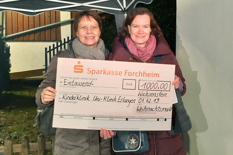 Am ersten Adventswochenende fand an der Pfarrkirche St. Erhard in Gößweinstein-Wichsenstein ein Weihnachtsmarkt statt, der von allen Wichsensteiner Vereinen ausgerichtet wurde. Auch in diesem Jahr spendeten diese ihren gesamten Erlös für wohltätige Zwecke: Ingrun Löwe und Dagmar Kußberger, Mitarbeiterinnen des Bunten Kreises an der Kinder- und Jugendklinik (Direktor: Prof. Dr. Joachim Wölfle) des Universitätsklinikums Erlangen, freuten sich, 1.000 Euro für ihre Arbeit entgegenzunehmen. „Mit diesem Betrag können wir vor allen Dingen unsere Fahrtkosten finanzieren, die von den Krankenkassen nicht übernommen werden“, berichtet Dagmar Kußberger.