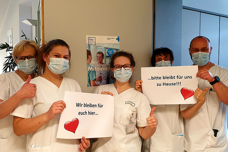 In den sozialen Medien macht seit Kurzem der Hashtag #bleibzuhause die Runde. Immer mehr Krankenhäuser beteiligen sich und bitten die Menschen, die momentan aufgrund des Coronavirus nicht in die Arbeit, zur Schule oder zur Universität gehen dürfen, zu Hause zu bleiben. Auch am Universitätsklinikum Erlangen sind Ärzte und Pfleger täglich an ihrem Arbeitsplatz im Einsatz, um die Patienten zu versorgen. „Wir bleiben für euch hier – bitte bleibt für uns zu Hause!“ – das ist die klare Botschaft des Erlanger Pflegepersonals an alle Daheimgebliebenen, um weitere Ansteckungen zu verhindern. „Wir wollen zeigen, dass uns die bestmögliche Versorgung der Patienten am Herzen liegt und freuen uns sehr, dass unser Appell via Facebook gut ankam. Bisher haben wir nur positive Kommentare von Nutzern erhalten und hoffen, dass unser Statement Wirkung zeigt und die Menschen wirklich zu Hause bleiben“, sagte Angela Rahn von der Pflegedirektion des Uni-Klinikums.