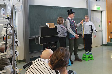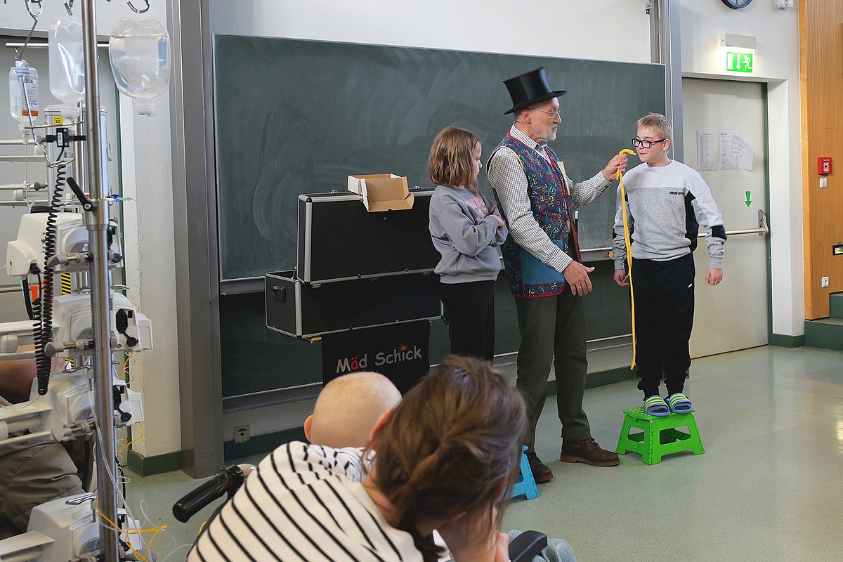 Würfel verschwinden aus Kisten, Zauberstäbe hüpfen wie von Geisterhand umher und kleine gelbe Bälle vervielfachen sich – das kann nur eins bedeuten: In der Kinder- und Jugendklinik des Uniklinikums Erlangen wird wieder gezaubert. Der Magiekünstler Klaus Hasselbacher alias „Mäd Schick“ begeisterte die jungen Patientinnen und Patienten, Geschwister und Eltern mit jeder Menge zauberhafter Spielereien. Bei seinen verblüffenden Tricks durfte immer wieder auch das Publikum mitmachen, was für große Begeisterung sorgte. Der Auftritt wurde vom Betriebsrat der Martin Bauer GmbH & Co. KG organisiert. Dieser veranstaltet jedes Jahr eine weihnachtliche Spendenaktion – mit einem Teil des Erlöses wurden nun der Zauberer sowie einige Geschenke für die jungen Patientinnen- und Patienten der Kinderklinik des Uniklinikums Erlangen ermöglicht.