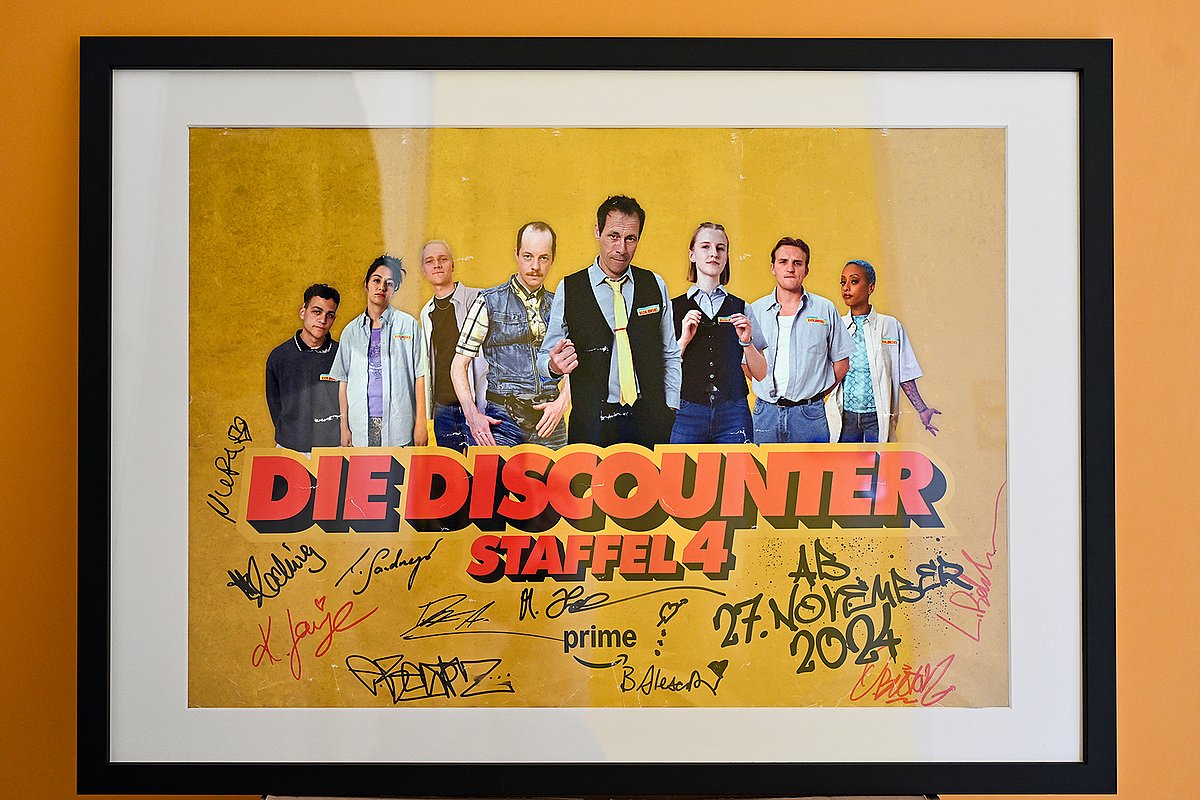 Anke Engelke, Fahri Yardim, Axel Milberg, Luisa Neubauer, Jan Böhmermann: Sie alle und viele weitere Prominente waren Gastdarstellerinnen und Gastdarsteller in der vierten und vorerst finalen Staffel der Erfolgsserie „Die Discounter“. Hauptdarsteller Marc Hosemann, der den gestressten Filialleiter von „Feinkost Kolinski“ verkörpert, und seine Schauspielkolleginnen und -kollegen signierten bei der Premiere der jüngsten Staffel ein exklusives Filmplakat, das jetzt zugunsten der Kinderonkologie (Leiter: Prof. Dr. Markus Metzler) des Uniklinikums Erlangen versteigert wird.
