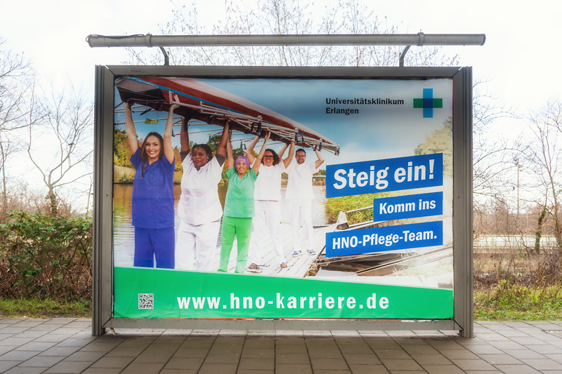 "Steig ein!" und "Zieh mit!" ruft es dieser Tage von Großplakaten in Erlangen, Fürth und Bamberg. Zu sehen: Ein Kollegenteam aus der Hals-Nasen-Ohren-Klinik - Kopf- und Halschirurgie (Direktor: Prof. Dr. Dr. h. c. Heinrich Iro) des Universitätsklinikums Erlangen, das buchstäblich an einem Strang zieht und ein Boot des Rudervereins Erlangen in die Höhe stemmt. Die Plakate sind Teil einer jetzt gestarteten Kampagne zur Personalakquise in der Pflege. Zusätzlich gibt es die Website www.hno-karriere.de, Mitarbeiter-Videos, eine Hotline und eine Online-Kurz-Bewerbung in nur wenigen Klicks.