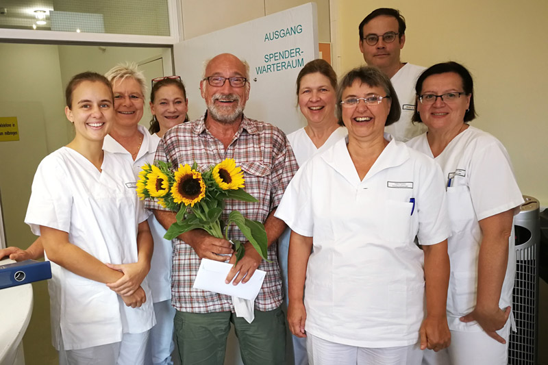 Im Blutspendebereich der Transfusionsmedizinischen Abteilung (Leiter: Prof. Dr. Holger Hackstein) des Universitätsklinikums Erlangen in der Schillerstraße 8 herrscht im August und September das, was man landläufig „Sommerloch“ nennt: Die blutspendefreudigen Studenten haben Erlangen während der Semesterferien verlassen, und auch viele andere treue Blutspender sind verreist. Da kommt es umso mehr auf langjährige Spender wie Karl-Heinrich Burger aus Heßdorf und Gerhard Schmeisser aus Erlangen an. Zusammen haben die beiden Männer bis heute über 1.100-mal Blut gespendet – meist Thrombozyten oder Blutplasma.