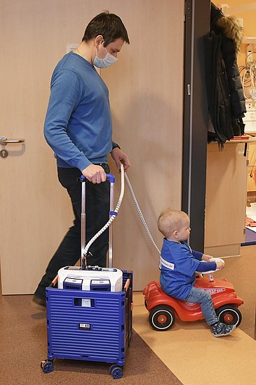 Jakob schiebt das 15-Kilo-Kunstherz vor sich her