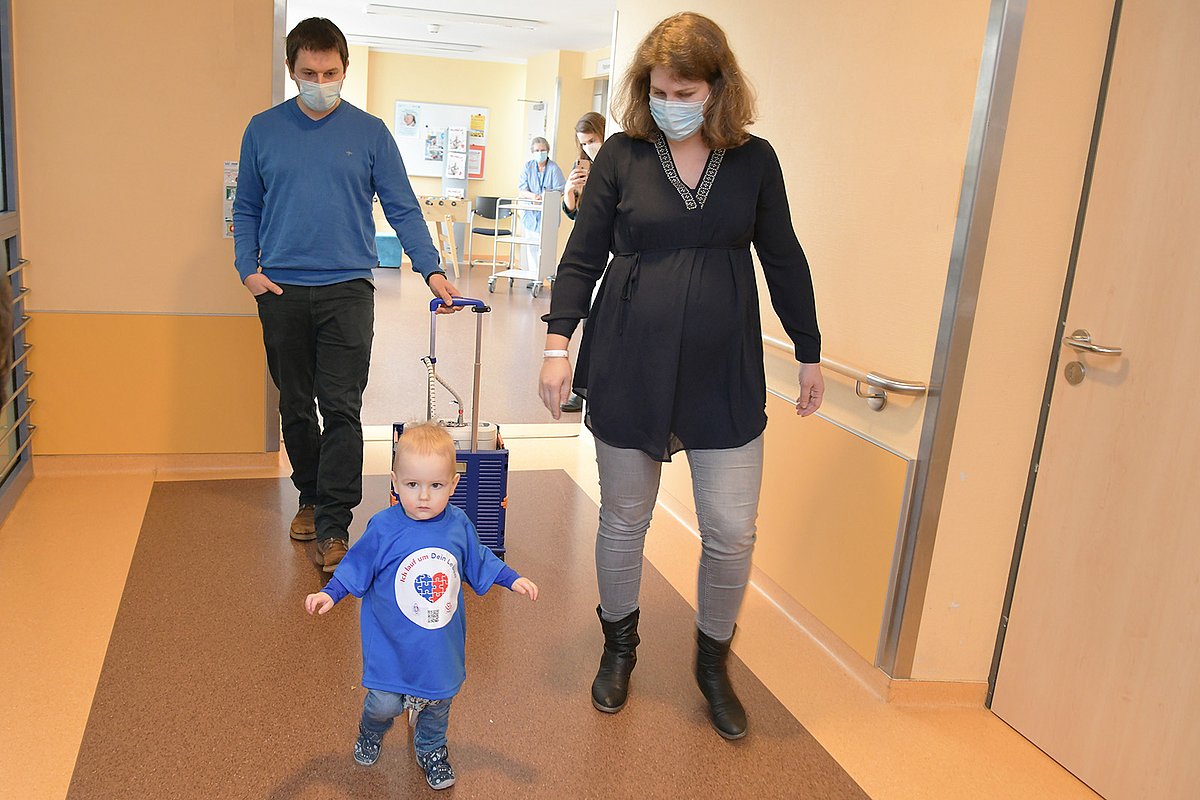 Im September 2019 kam der sechs Monate alte Junge dann zur Weiterbehandlung ans Universitätsklinikum Erlangen. Nach einer Herzkatheteruntersuchung wurde der kleine Jakob im Januar 2020 dann operiert: Das sogenannte pulmonale Banding sollte den Druck in der rechten Herzkammer erhöhen und somit die linke Herzkammer unterstützen. Doch der Eingriff brachte nicht den gewünschten Erfolg. Jakobs Mutter berichtet: „Er trank irgendwann immer weniger und wollte immer öfter getragen werden. Er konnte nicht einmal mehr die Treppe hochkrabbeln.“ Sein Zustand verschlechterte sich so sehr, dass Jakob schließlich im November 2020 an ein Kunstherzsystem angeschlossen wurde. Bei dem System liegt die Blutpumpe außerhalb des Körpers; über Kanülen im Körper sind die Schläuche der Pumpe mit Jakobs Herz und mit den Blutgefäßen verbunden. Die Antriebseinheit für das Kunstherz ist fast so groß wie Jakob selbst, wiegt rund 15 Kilogramm und begleitet den Kleinen seither rund um die Uhr. Der Junge kann das Gerät selbst über den Gang der Erlanger Kinderkardiologie schieben.