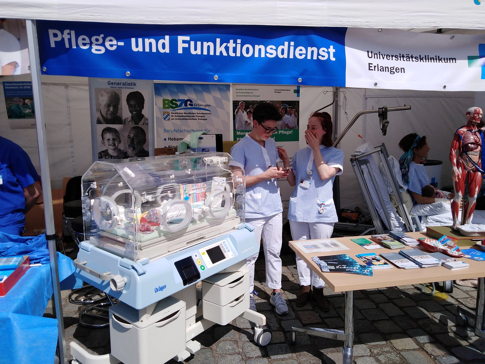 In Kooperation mit dem Universitätsklinikum und der Akademie für Pflegeberufe präsentierten Lehrkräfte und Schülerinnen des BSZG Erlangen die vielfältigen Ausbildungsmöglichkeiten. Viel Aufklärungsbedarf gab es besonders…